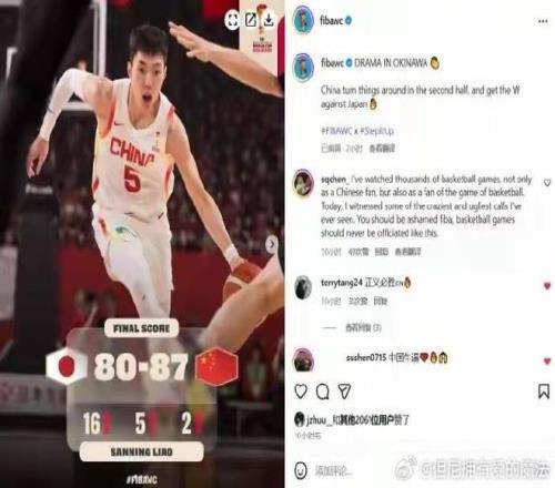 令人驚訝的是,賽后,F(xiàn)IBA世界杯的Instagram官方賬號卻這樣寫道:“沖繩神劇本!中國男籃從日本偷走一場勝利(China with a sneaky win over Japan)。”這樣的描述引發(fā)了評論區(qū)翻車。