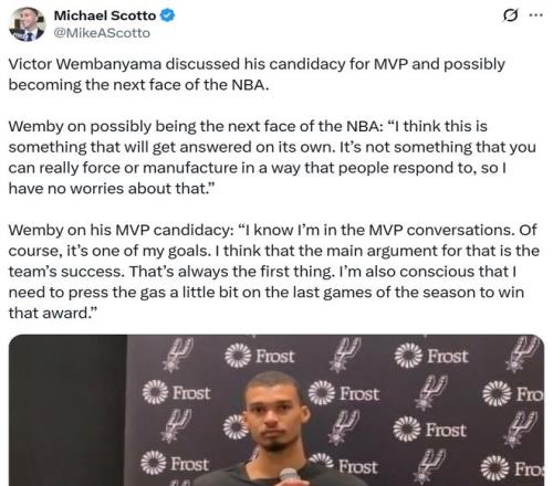 當談到自己被納入MVP爭奪討論,文班坦言:“這是我的目標之一,但這基于球隊成功,我也需要再加把勁。”