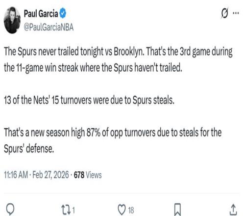 本場籃網15次失誤中有13次是馬刺隊搶斷造成,對手87%的失誤由搶斷造成也創造馬刺本季新高。