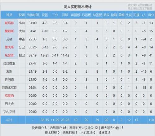艾頓更衣室發泄不滿之后,今天3投1中僅得2分4板,正負值-24全場最低。詹姆斯出戰35分鐘,投籃16中7,三分3中0,罰球2中1,拿到15分6板5助,正負值+5。太陽最后一攻,阿倫突進內線,詹姆斯想起跳封蓋,跟東契奇撞一起。