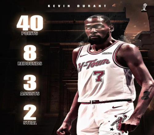 這場比賽,杜蘭特打出了加盟火箭之后最好的表現之一:全場出戰39分鐘,投籃28中14,三分10中2,罰球10中10,得到40分8籃板3助攻2搶斷,正負值+10。