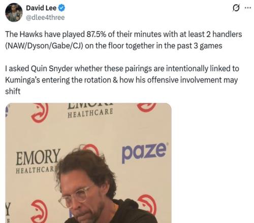 同時老鷹隊記追問本場球隊87.5%的時間中使用至少雙后衛陣容,是否有意安排陣容以幫助庫明加快速融入體系時,斯奈德也給出肯定回答。