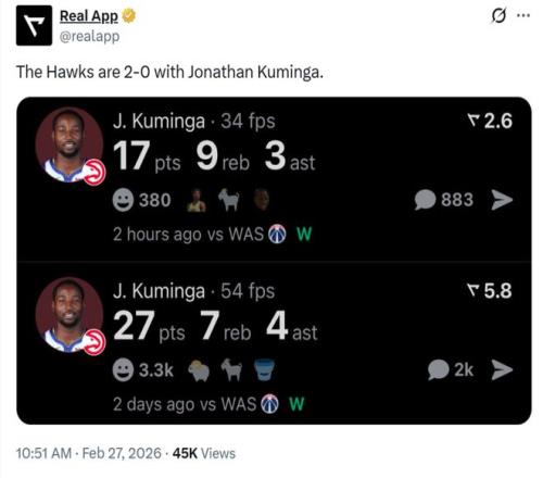 老鷹主帥斯奈德賽后談及庫明加本場的表現時稱贊道:“他現在非常專注于分享球,打得十分無私。”