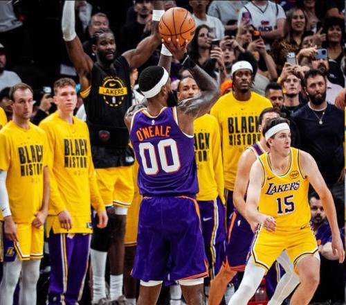 在本場比賽的最后時刻,詹姆斯補籃一度將比分扳平,在比賽最后還剩下22.8秒的時候,雙方戰成110平,太陽利用快速轉換,找到大空位的奧尼爾,隨后奧尼爾不負眾望,三分投進,只留給湖人0.9秒的時間,準絕殺對手。在上一場面對魔術的比賽中,湖人被小溫德爾-卡特補籃準絕殺。