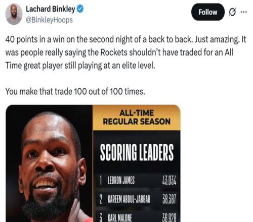 面對(duì)杜蘭特這樣的表現(xiàn),隊(duì)記Lachard Binkley不禁感嘆道:“竟然有人認(rèn)為火箭隊(duì)不應(yīng)該交易得到這位仍然處于巔峰狀態(tài)的歷史級(jí)球員,這種交易就算重來(lái)100次你都一定會(huì)做。”