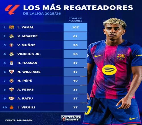 西甲過人榜:亞馬爾107次斷層領跑,姆巴佩62次第2,維尼修斯第4