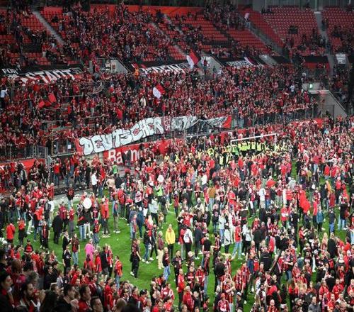 2024年4月14日,勒沃庫森隊球迷賽后涌入球場慶祝球隊奪冠。 當日,在2023-2024賽季德國足球甲級聯賽第29輪比賽中,勒沃庫森隊主場5比0戰勝云達不來梅隊,提前鎖定本賽季德甲聯賽冠軍。這也是勒沃庫森隊歷史上首個德甲冠軍。 新華社發(烏爾里希·胡夫納格爾 攝)