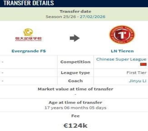 北京時(shí)間2月27日,德轉(zhuǎn)更新,遼寧鐵人約100萬人民幣簽下恒大足校17歲后衛(wèi)張洪福。