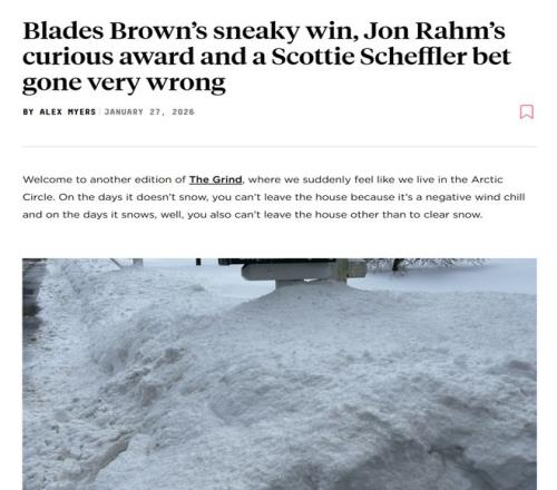 再比如《高爾夫文摘》1月27日對巴哈馬國際巡回賽的戰(zhàn)況介紹標(biāo)題為“Blades Brown’s sneaky win, Jon Rahm’s curious award and a Scottie Scheffler bet gone very wrong”(布萊茲?布朗的意外制勝、喬恩?拉姆的離奇獎(jiǎng)項(xiàng),還有斯科蒂?謝夫勒那場徹底搞砸的賭約)。