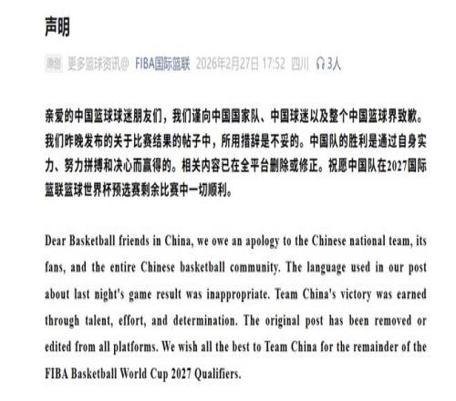 親愛的中國籃球球迷朋友們,我們謹向中國國家隊、中國球迷以及整個中國籃球界致歉。我們昨晚發布的關于比賽結果的帖子中,所用措辭是不妥的。中國隊的勝利是通過自身實力、努力拼搏和決心而贏得的。相關內容已在全平臺刪除或修正。祝愿中國隊在2027國際籃聯籃球世界杯預選賽剩余比賽中一切順利。