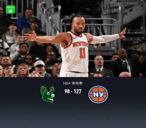 第四節雄鹿小特倫特拿下5分,尼克斯唐斯拿下5分,最終雄鹿98-127不敵尼克斯