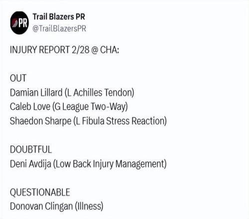 開(kāi)拓者最新的傷病名單顯示,明日對(duì)陣黃蜂,利拉德、樂(lè)福、夏普是缺陣狀態(tài),阿夫迪亞因背部傷病管理大概率也不打,生病的克林根出戰(zhàn)成疑。楊瀚森和羅威都不在傷病名單中。羅威上一場(chǎng)比賽得到14分14籃板2搶斷4蓋帽的全面數(shù)據(jù),瀚森DNP,沒(méi)有獲得出場(chǎng)機(jī)會(huì)。