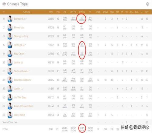 CBA三將方面,林庭謙是目前狀態(tài)最好,對(duì)陣韓國(guó)的比賽,登場(chǎng)33分鐘,10中7得到18分3籃板3助攻,陳盈駿12中5,得到13分5籃板4助攻。