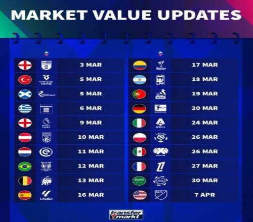 北京時間2月28日凌晨,德國轉會市場公布了各聯賽球員最新一期身價的更新時間,其中英超將在3月9日公布,西甲在3月16日公布,德甲在3月20日公布,意甲在3月24日公布,法甲在3月27日公布。