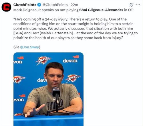 加時賽開打,亞歷山大、哈爾滕施泰因兩人都在場下休息,整個加時賽SGA一分鐘沒打,最關鍵的一波攻防是終場前1分22秒,又是卡魯索他搶斷了小哈的傳球后上籃命中,這一球后雷霆領先到5分。