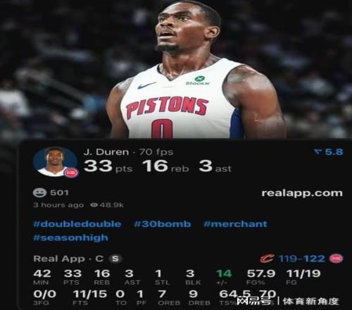 不過話說回來,這場比賽除了騎士的兩大內線表現出色外,活塞的杜倫也是毫不遜色。他全場狂轟33分,還搶下了16個籃板,這豪華的兩雙數據,簡直讓人看得眼花繚亂。他和阿倫在禁區內的每一次對位、每一次攻防博弈,都成了比賽中最吸引人的看點,讓人看得熱血沸騰!
