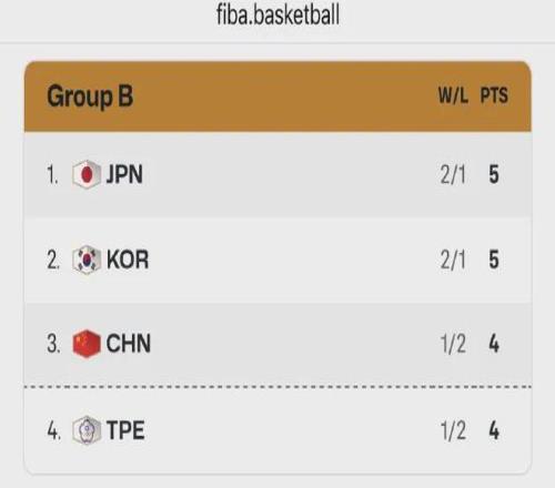 根據最新排名,盡管中國男籃和中國臺北隊都是1勝2負,可憑借凈勝分優勢位列B組第三。