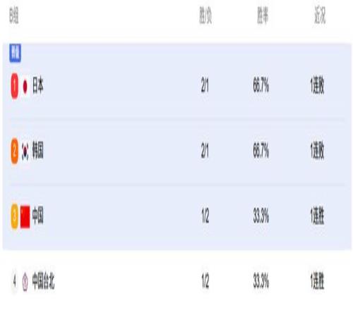 目前,B組的積分為:日本隊5分第一名,韓國隊5分第二名,中國隊4分第三名,中國臺北隊墊底。