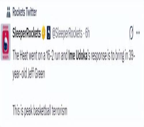 休媒也指責烏度卡,在熱火打出那一波16-2的攻防浪潮后,烏度卡沒有任何的調整,他只將39歲的杰夫-格林給換上。這簡直就是恐怖主義的籃球巔峰。