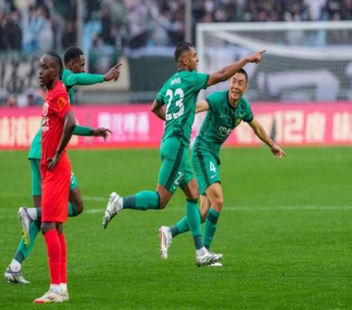 3月1日,北京國安隊球員達萬(右二)在比賽中慶祝進球。新華社記者 李博 攝