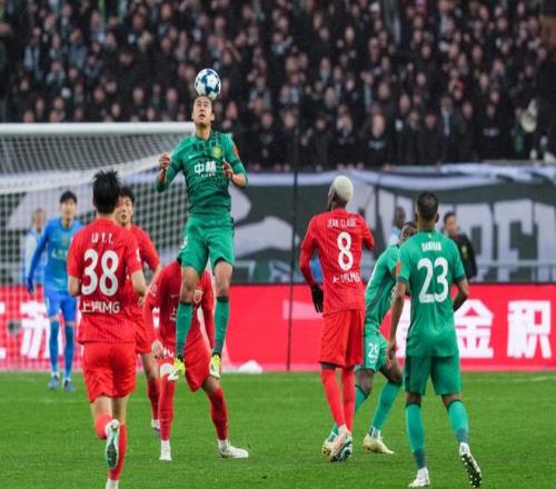 3月1日,北京國安隊球員張玉寧(上)在比賽中爭頂。新華社記者 李博 攝