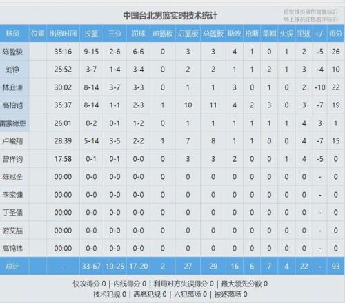 陳盈駿26分3板4助、林庭謙22分3助、高柏鎧19分11板4助2斷3帽、盧峻翔15分8板。最后看看數(shù)據(jù),說說你的感受: