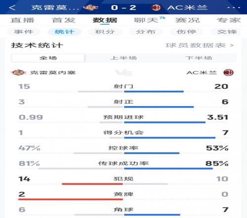 體育播報(bào)3月1日宣 在本輪意甲,AC米蘭2-0擊敗克雷莫內(nèi)塞,以下為雙方全場(chǎng)數(shù)據(jù)對(duì)比: