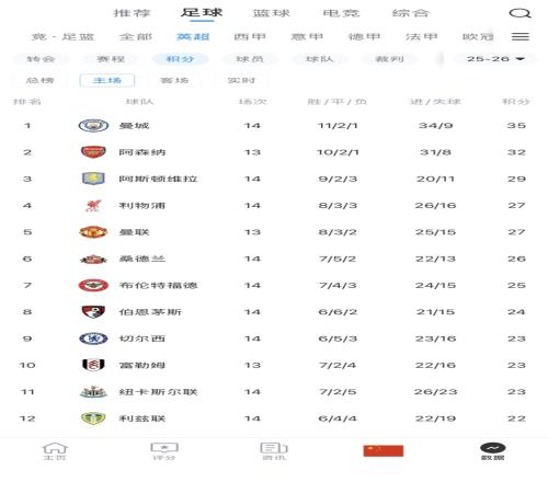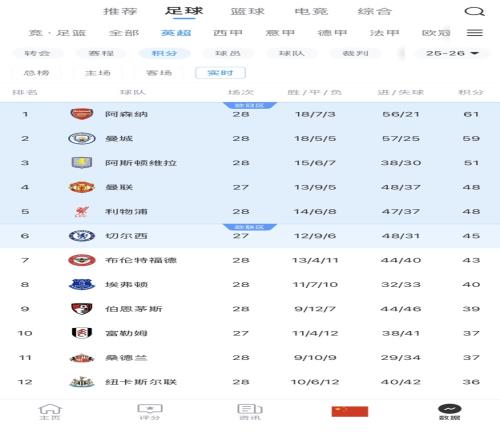 體育播報實時積分榜已全面覆蓋英超、西甲、意甲、德甲、法甲、新賽季中超,以及歐冠、歐聯、世界杯等熱門賽事。