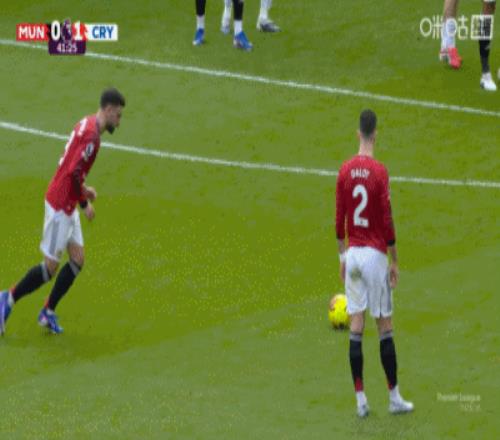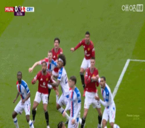 第43分鐘,曼聯前場左側任意球,B費主罰送入禁區,卡塞米羅頭球攻門稍稍偏出。↓