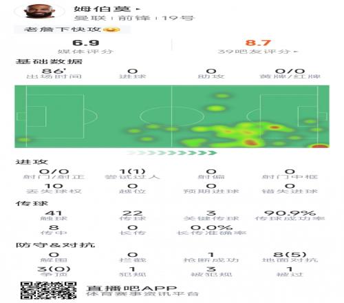 體育播報3月1日宣 在本輪英超曼聯(lián)對陣水晶宮的比賽中,姆伯莫首發(fā)出場,以下為他在本場數(shù)據(jù):