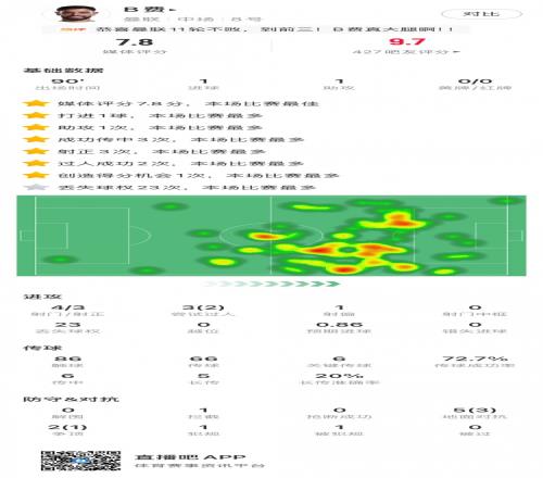 本場比賽B費為曼聯首發踢滿全場,貢獻傳射,收獲7.8分的全場最高分。
