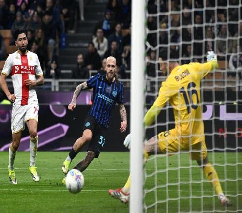 開場后,國米展現出了實力上的巨大優勢,而且率先利用定位球制造威脅,前15分鐘就有德弗里和阿坎吉在角球進攻中制造出射門機會。之后,國米又在運動戰中發力,第16分鐘博尼在禁區內抽射卻被對方門將神勇撲出,第26分鐘姆希塔良禁區外的遠射碰到防守球員發生折射后擊中橫梁,而在第31分鐘又是博尼禁區內的頭球攻門被門將拒之門外。這三次射門都極具威脅,但奈何對方門將和梅阿查的橫梁都有發揮,球隊也一直沒能破僵。