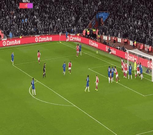 第45分鐘,切爾西獲得角球,拉亞被人群擠壓的情況下,反身完成撲救。這一次防守過程中,賴斯抱人+手肘觸球,切爾西球員投訴,裁判沒有任何表示。