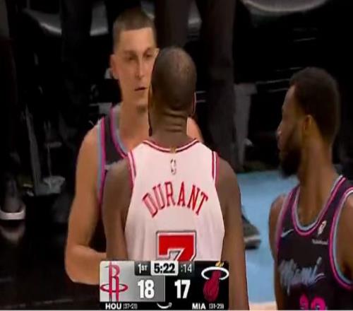 火箭過去3場連贏爵士、國王與魔術收獲3連勝,熱火過去兩場連續客場輸給雄鹿與76人遭遇2連敗。本場火箭缺少范弗利特、亞當斯、泰特與賈巴里-史密斯,熱火缺少鮑威爾、約維奇與羅齊爾。首節開局,拉松一條龍上籃命中全場首球,阿門、謝潑德與申京聯手打出11-0攻勢,拉松上籃命中,謝潑德三分擴大14-4領先。熱火連中三分一波11-2打停火箭,杜蘭特與希羅言語沖突各吃一T,杜蘭特與韋爾對攻一記三分。哈克斯內線得分,火箭連得5分,熱火一波10-0攻勢反超6分,阿門上籃命中,首節結束火箭28-32落后熱火。首節火箭三分8中3,阿門8中5得到11分與杜蘭特5中3得到9+2+2+2帽;熱火三分13中6,全隊已經8人得分。