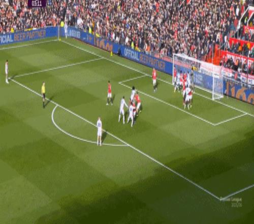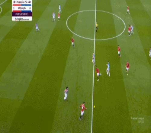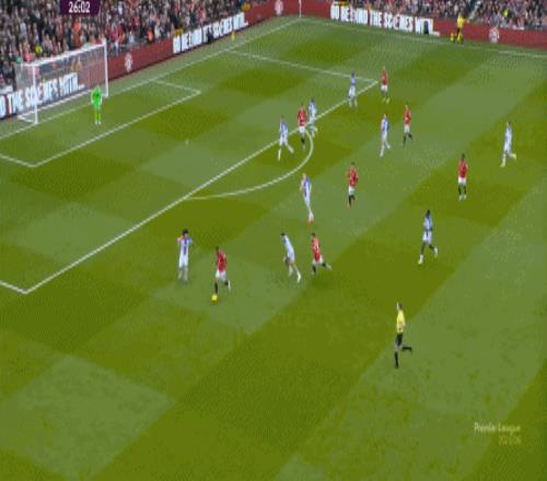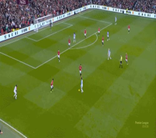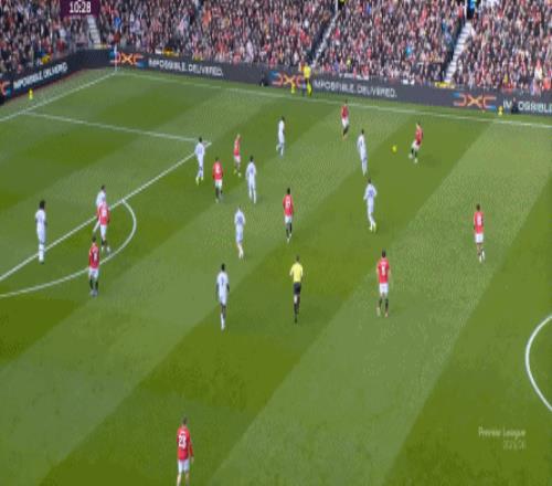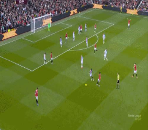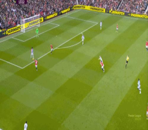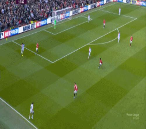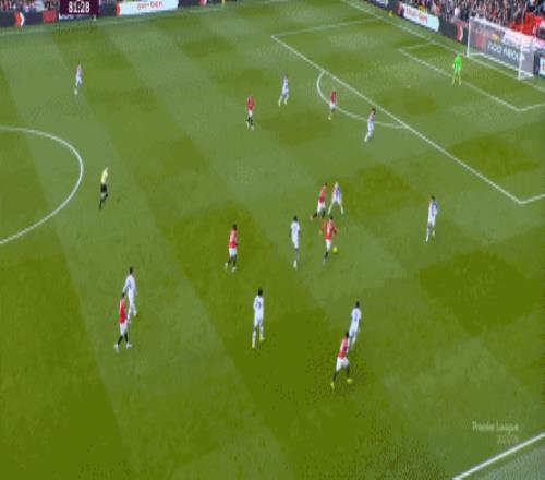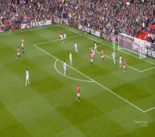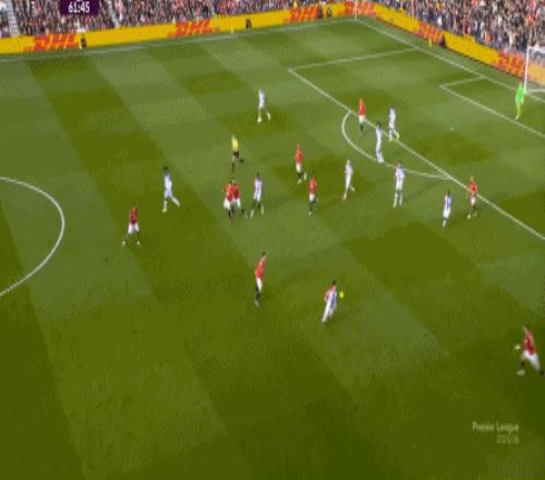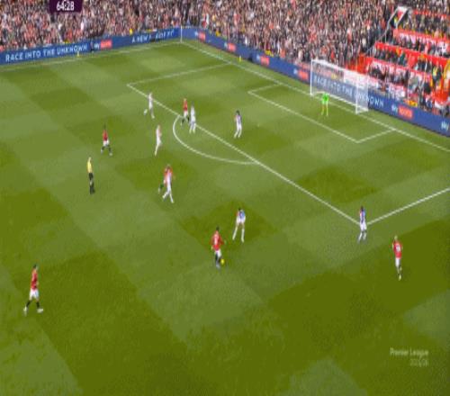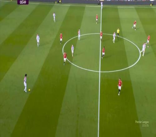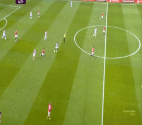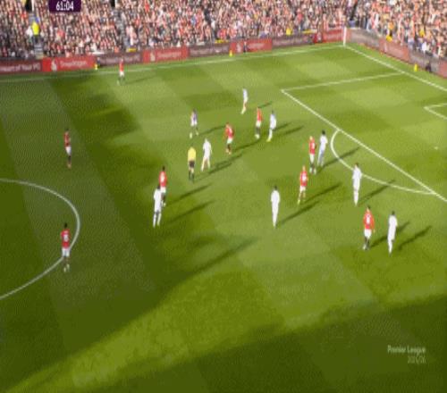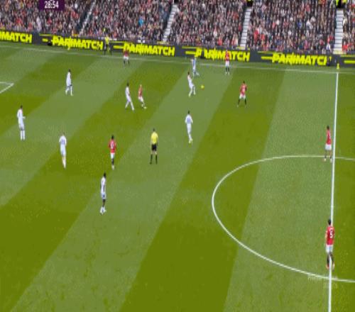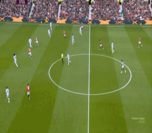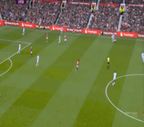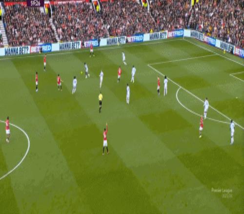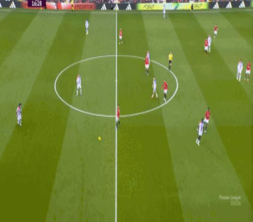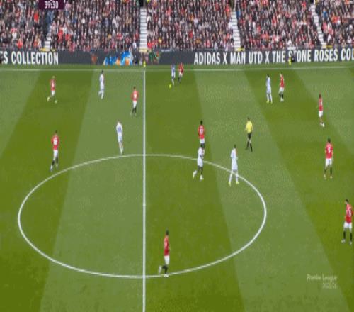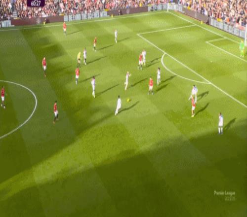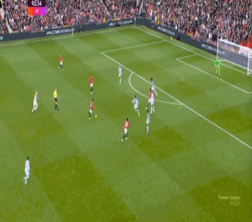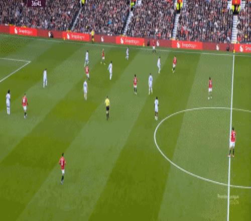 在這場比賽之前,曼聯的進攻思路是充分拉高跑動量,讓前場四人自由換位,甚至形成某個半扇或局部的集聚態勢,這場比賽也不是沒有這樣的例子,就像第11分鐘,庫尼亞便來到右路,和姆貝烏莫形成一前一后的站位,從而在右路送上傳中: