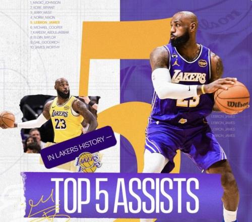 詹姆斯湖人生涯總助攻數達3669次,升至隊史助攻榜第五位