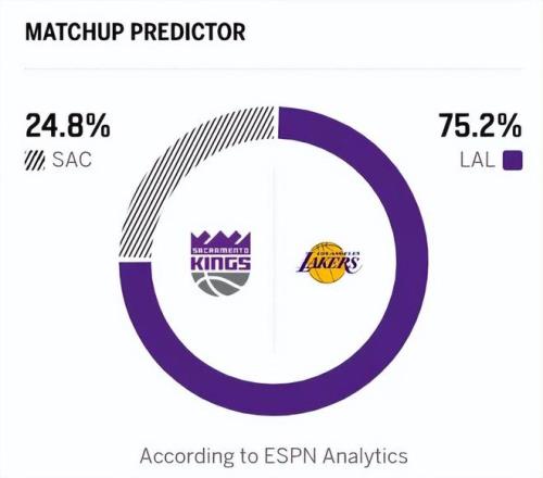 反觀國王這邊,上一場擊敗獨行俠后,近3場比賽2勝1負,戰績14勝47負位列西部倒數第一。目前這支國王心思完全在擺爛上,小薩、拉文等核心全部賽季報銷,球隊以鍛煉新人為主,不過威少倒是競爭意識不錯,雷諾成為球隊年輕球員中的佼佼者。賽前,ESPN預測此戰的結果:湖人勝率高達75.2%,國王勝率低至24.8%