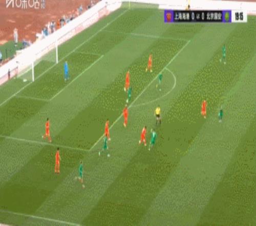 比賽進行到上半場第19分鐘時,北京國安進攻到海港禁區右側,楊立瑜想過楊希卻失敗,后者解圍時皮球遭另一國安球員李磊的攔截,但李磊停球過大被附近的安佩姆搶先把球趟走。這安佩姆的速度太快了!只見過把球趟起來對手球員根本攔不住(下圖)。