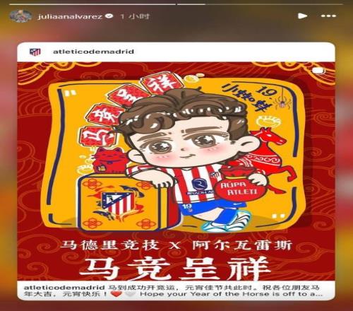3月3日傳統的元宵節,北京時間3月2日,馬競官方在社交媒體上用中英雙語向中國球迷送上了祝福,隨后,阿爾瓦雷斯在社交媒體上轉發了這條動態。