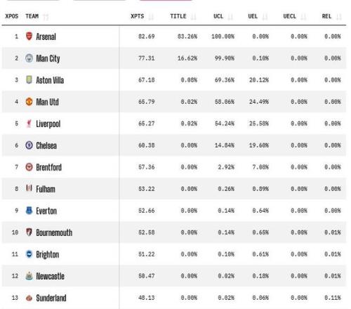 隨著英超第28輪比賽的結束,英超積分榜也發生了一定的變化,其中最受關注的自然還是曼城和阿森納之間的冠軍之爭。本輪比賽阿森納是力克切爾西拿到了比賽的勝利,曼城雖然也取勝但仍然在積分榜上落后阿森納5分。數據分析機構在本輪比賽全部結束后更新了英超的奪冠概率,中阿森納83.26%領跑,曼城16.62%,維拉0.08%,曼聯和利物浦0.02%,這也是有可能奪冠的全部球隊。