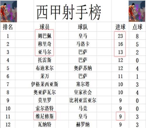射手榜方面,傷缺的姆巴佩還是23球領跑,穆里奇16球排在第2,亞馬爾13球第3,托雷斯,布迪米爾12球并列第4。維尼修斯今天錯失超級單刀,還是和莫里羅,索爾洛特,瓦納特9球剛好擠入前十。