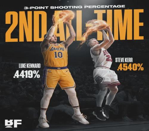 此外,肯納德在湖人每次投籃出手能得到1.59分,這一數(shù)據(jù)在聯(lián)盟所有后衛(wèi)和鋒線當(dāng)中排第一。肯納德在NBA打了9個賽季,只有2個賽季三分命中率低于四成,但從未低于過39%。肯納德NBA生涯場均出手4.3記三分,命中率44.2%。