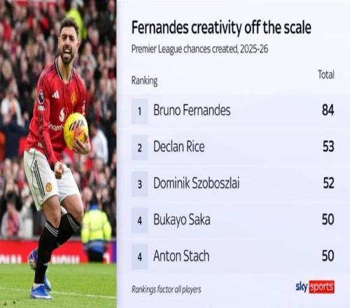 天空體育:本賽季至今,B費在英超聯賽中創造84次機會,是所有球員中最多的,第2名的賴斯共創造53次機會。