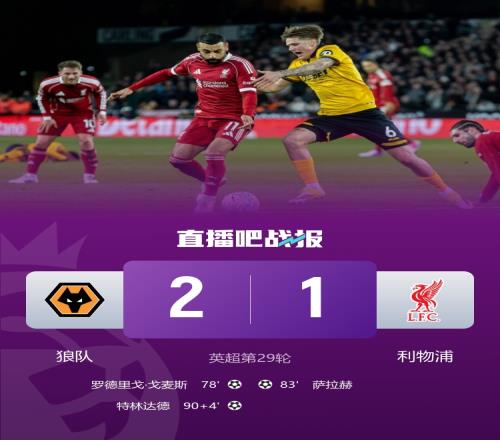 體育播報(bào)3月4日宣 北京時(shí)間3月4日凌晨4:15,2025-26賽季英超聯(lián)賽第29輪,利物浦在莫利諾克斯球場(chǎng)客戰(zhàn)狼隊(duì)。上半場(chǎng)兩隊(duì)均無(wú)建樹,暫0-0戰(zhàn)平;下半場(chǎng)加克波失空門,羅德里戈·戈麥斯替補(bǔ)破門,薩拉赫扳平,特林達(dá)德絕殺,最終利物浦1-2狼隊(duì),聯(lián)賽三連勝終結(jié),仍排在積分榜第五。