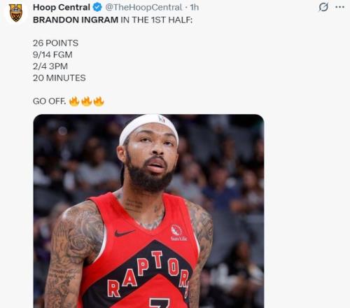 上半場猛龍是靠英格拉姆支撐,20分鐘里14中9,三分4中2,拿到26分,尤其是首節7中5+三分3中2+罰球4中4,拿到16分,都覺得此役他要以一己之力扛起猛龍了,結果從第三節開始斷電。