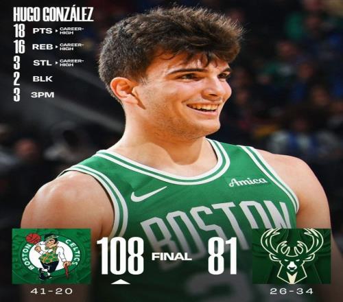 凱爾特人客場108-81大勝雄鹿,杰倫-布朗缺席,新秀雨果-岡薩雷斯頂上了首發。