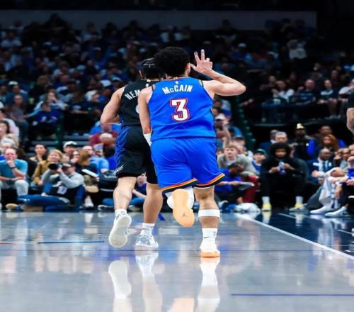 前兩天雷霆加時戰勝掘金的比賽后,切特-霍姆格倫這么評價拿到14分的新隊友麥凱恩。那場比賽,麥凱恩8投6中,三分3中2,關鍵第四節拿到了8分。