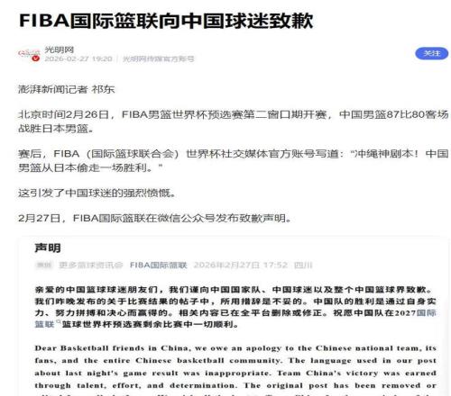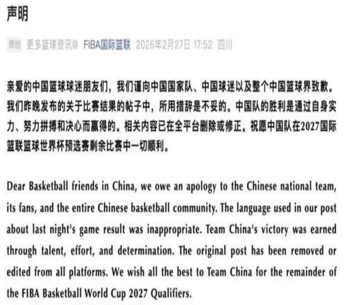 面對潮水般的口誅筆伐,2026年2月27日,國際籃聯被迫發布了官方致歉信,正式承認文案措辭極不妥當,并向中國籃協及廣大球迷致以歉意