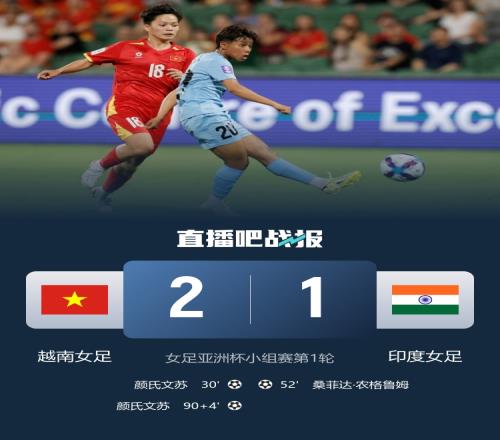 體育播報(bào)3月4日宣 北京時(shí)間3月4日下午17:00,女足亞洲杯小組賽第1輪,越南女足在HBF公園對(duì)陣印度女足。上半場(chǎng),阮氏碧翠遠(yuǎn)射中楣,顏氏文蘇兜射破門。下半場(chǎng),桑菲達(dá)·農(nóng)格魯姆單刀破門,顏氏文蘇94分鐘絕殺。全場(chǎng)結(jié)束,越南女足2-1印度女足,迎開(kāi)門紅。