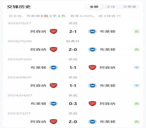 阿森納聯賽19勝7平3負積64分位居英超榜首,各項賽事已連續9場不敗;布萊頓聯賽9勝10平9負積37分暫位英超第12,目前已獲兩連勝。阿森納對陣布萊頓已連續6場不敗(4勝2平)。